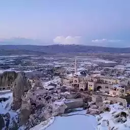 Göreme in winter feels like stepping into a fairytale. The famous rock formations and cave houses of Cappadocia are covered with a soft blanket of snow creating a magical and surreal landscape. The chimneys and valleys that usually glow under the sun take on a new beauty under the winter sky.
