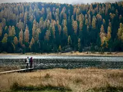 🍂 This lake is known for its calm, windless waters and its surrounding mountains, dotted with only larch trees. This type of pine only changes its leaves to yellow, brown, and gold, and grows only in limited areas, at altitudes of 1,500 meters above sea level.