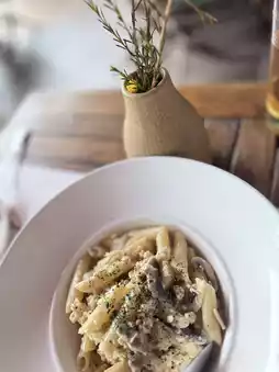 Pollo e Funghi: shredded chicken with creamy white wine sauce served with penne pasta—simple yet tasty.