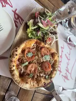 Pizza (7 inches) with tuna, tomato, and mozzarella, generously topped with tuna flakes. If you're used to spicy salami, switching to tuna offers a refreshing change! The pizza is delicious and definitely worth trying.