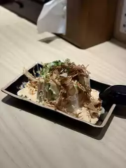 A brick of frozen tofu, tender, served with sesame sauce, plus covered with wood fish flowers and spring onions, very appetizing.