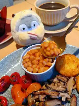 I chose the all-day breakfast set 😍. The portion was generous and packed with ingredients 👍, including sausages, bacon, scrambled eggs, toast, cherry tomatoes, baked beans, and hash browns 😆. It was truly rich and delicious 😎.