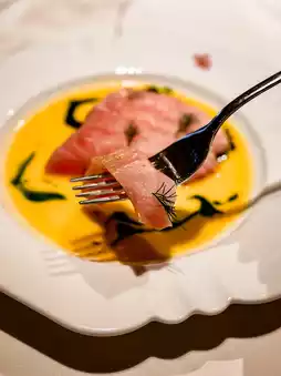 The tender slices of amberjack soaked in citrus juice reveal a delicate translucent pink, gently wrapped in the herbal aroma of dill oil. Every bite evokes the gentle Mediterranean breeze.