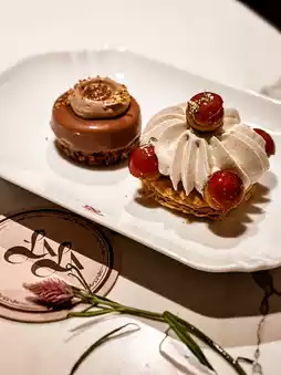 Six handcrafted French desserts shine on the dessert cart! The Chocolate Tart represents the pinnacle of French patisserie — rich dark chocolate perfectly balanced with silky cream, and a crust with a subtle caramel aroma. The St-Honoré is visually stunning, with a crispy pastry base topped with sweet custard, fresh cream, and caramel. One bite delivers a rich combination of crisp, soft, smooth, and sweet textures that is deeply satisfying.