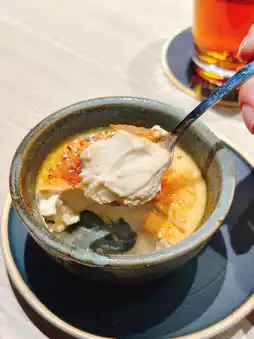 Miso French Omelette 🍮 Single order $48 💰Creamy Delicate 💯 Egg flavor is rich 🥚 with miso savory, plus the surface is thin and crispy caramel 🔥 Sweet and salty intertwined ☺️ There are also sweet potatoes and bean paste 🫘 at the bottom