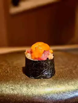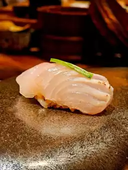 The sushi selection includes five varieties: golden eye snapper, Amakusa prawn, leatherjacket fish, striped beakfish, and sea urchin with tuna tartare and grilled matsutake mushrooms, all bursting with aroma and full of surprises. The sour kombu turtle fish offers a rich texture.
