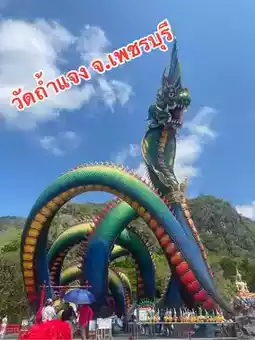 🌟 Wat Tham Chaeng, Phetchaburi Province, is a temple that stands out with "Father Grandfather Phaya Phetkiri Mahamuni Sri Suthonakraj", the largest Naga in Thailand. It is 31 meters high and 227 meters long, and is a shiny emerald green. The Naga is coiled in the shape of a 9-round Unalome Yantra, beautifully and gracefully surrounded by peaceful nature. In addition, inside the temple, there is Tham Chaeng, a beautiful stalactite and stalagmite cave. It is a place for meditation and worship of sacred objects. Wat Tham Chaeng is a tourist attraction that perfectly combines the beauty of architecture, sacredness, and nature.