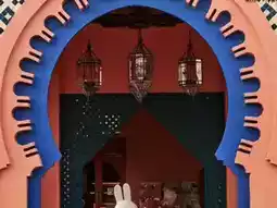 Adorable Ambience: The café boasts a cozy setting adorned with Miffy-themed decorations, including plush toys, mugs, and tableware. The interior design features a blend of Moroccan aesthetics, characterized by blue and terracotta tones, creating a warm and inviting environment.