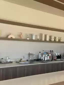The shop is decorated in a minimalist-tropical style with earth tones that perfectly match the sea view. There are many photo spots, including beach hammocks, wooden tables by the beach, and a bean bag zone on the sand.