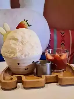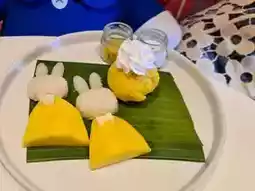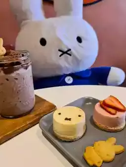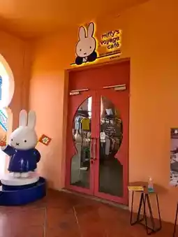 Miffy's Voyage Café Camel Republic is a café located in Cha-am, Phetchaburi Province. The decoration of the shop is very cute. Miffy is all over the shop. There are Miffy dolls on every table. If you go alone, you don't have to be lonely because she will sit with you. We ordered desserts and drinks. She decorated the plates very cutely. The shop has a very clear concept.