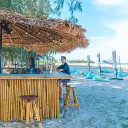 The atmosphere is good, the view is good, the beach is beautiful, the sky is clear, the sea is good
