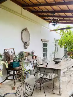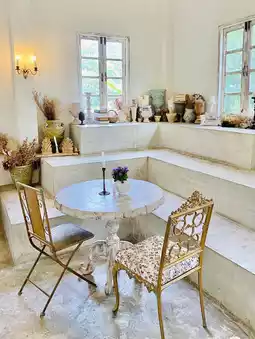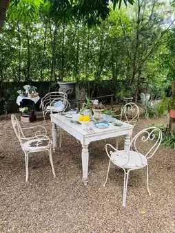 A charming white home cafe nestled amidst a French countryside garden. It's a haven for photo enthusiasts, featuring abundant lemon trees bearing fruit. For those interested, you can even purchase a tree to take home!
