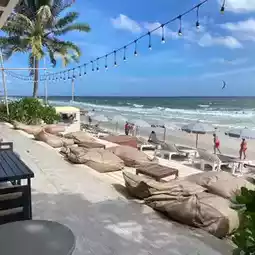 curtains gently fluttering, beanbags on the sand, and a coffee bar that opens up to the perfect sea breeze. Perfect for those who love simple but emotional photos. This place truly is a little paradise! 📸🏄🏼♀️🏖️