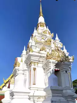 Phra That Chaiya is a Srivijaya-style pagoda from around the 13th-18th Buddhist centuries. The white pagoda is majestic, surrounded by small pagodas and a balcony around the pagoda. It looks very peaceful and powerful.