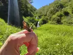 Reluctantly, we took the shuttle bus down to the "Yuehua Twin Waterfalls." The waterfalls were quite small and unimpressive! However, the surrounding butterflies 🦋 stole the show, landing on visitors, their bags, and even their hair, causing bursts of excitement. So adorable!