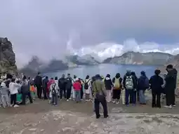 After entering the scenic area, we took a shuttle bus directly to Tianchi (Heaven Lake). Initially, the lake was shrouded in thick fog, obscuring its beauty. But after waiting a bit, it revealed itself. The blue lake water, paired with the white mist on the mountains, alternated between clear and hazy views. Wow! No phone camera could truly capture its beauty! Every shot looked amazing! On the other side of the viewing platform, there are two large stones surrounded by iron railings, engraved with "Changbai Mountain" and "Tianchi." The line to take photos here was incredibly long, as everyone felt they had to get a picture since they were already there. There were also professional photographers offering paid services.