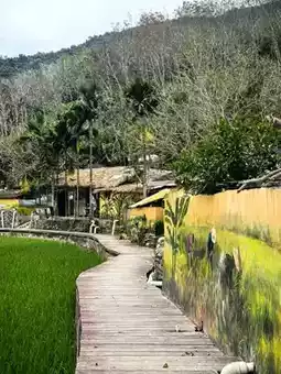 Hongshui Village is a treasure of Li ethnic customs, where time stands still under the shadow of the boat-shaped houses, as sweet as ever. Every inch of land in Hongshui Village carries a profound history, and every breeze seems to whisper ancient legends. The traditional Li boat-shaped houses are scattered throughout the village, like unfinished poems, immersing people in this simplicity and tranquility. Walking along the path, sunlight filters through the gaps in the leaves, forming spots of golden light, and the distant mountains complement the azure sky.