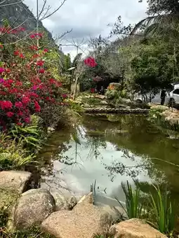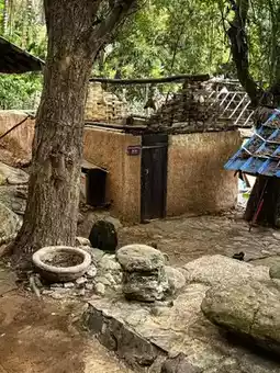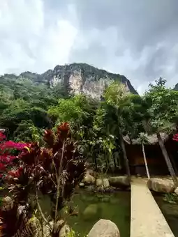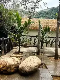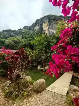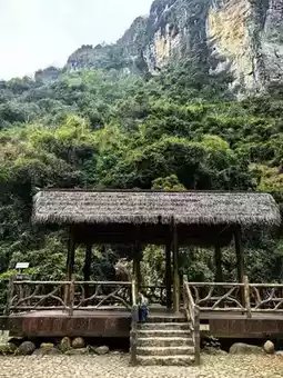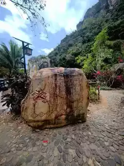 At the Baoshan Kapok Viewing Platform in Qicha Town, Changjiang County, Hainan Province, I admired the kapok flowers, which looked like rosy clouds and fire, complementing the green terraced fields and Li village houses, creating a picturesque gallery of early tropical spring. Following the navigation towards Wangxia Huangdi Cave for about an hour, we arrived at Wangxia Township. On the roadside, bougainvilleas were in full bloom, and a stream flowed down from a small hill-like rock, resembling a delicate bonsai, attracting people to stop and admire. Further ahead, at the fork in the road, the right side leads to Huangdi Cave, while the left side leads along a rugged mountain road, embarking on a journey to explore Hongshui Village in Changjiang, Hainan.