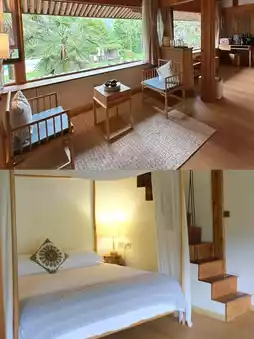 Private villas nestled on the hillside feature rustic wood and stilt-house designs. Check-in to the subtle scent of wood, and open the window to misty mountains, an infinity pool, and palm trees. Wake up to rolling mountain views—even the air feels green here.