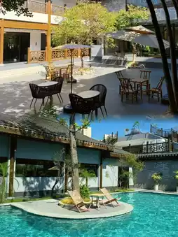 - The island boasts lush greenery, towering trees, and a sparkling blue swimming pool. White canopies dot the expansive lawn, and lounge chairs lazily face the lake. The wind-swept lotus leaves and distant white clouds create a picturesque natural scene.