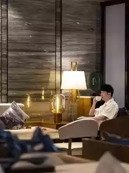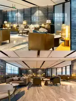 As you enter the lobby, you will see the tall space with double-sided floor-to-ceiling windows, which integrate the indoor and outdoor spaces, providing ample light and a wide view. The low-key colors and central art area design create a high-end and elegant visual atmosphere.