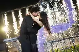 Festival Island Love Bridge: At dusk when the lights first come on, frame hand-holding backs on the bridge;