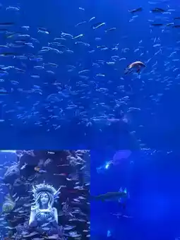 3. Reflection on the Ground: The reflective floor tiles at the bottom of the tank are a treasure! Water reflections + real person in the frame. Wear light-colored clothes for a sophisticated composition worthy of a magazine cover [__LINK_ICON].