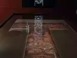Inside the exhibition hall, I stumbled upon a black and white mural that totally caught my eye. It’s a dramatic scene with ancient figures, setting the mood for the whole museum experience! 🎨
