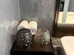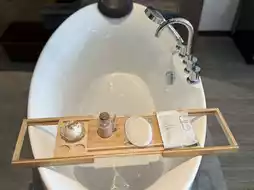 The bathroom design was equally impressive. A large bathtub with a wooden tray holding bath salts and bath bombs offered the perfect way to unwind after a busy day. The vanity area featured exquisite glassware and neatly rolled white towels, showcasing attention to detail and a sense of quality that made me feel truly cared for.