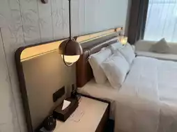 The bedroom area was full of delightful surprises. A soft, plush bed with crisp white linens and fluffy pillows invited me to sink in, instantly melting away any fatigue. The bedside lamps were thoughtfully designed, casting a warm yellow glow that was both cozy and soothing—perfect for reading or relaxing at night. A small sofa and round table nearby provided a comfortable space for resting or even some impromptu work.