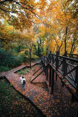 Walking on the wooden boardwalk covered with fallen leaves,