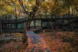 and the wooden boardwalk is covered with fallen red leaves,