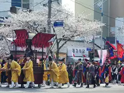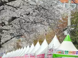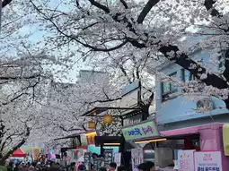The Jinhae Gunhangje Festival is a famous cherry blossom festival held every spring in Jinhae, South Korea. During the festival, the whole city is covered with beautiful pink cherry blossoms. People visit to walk along pretty spots like Yeojwacheon Stream and Gyeonghwa Station, take photos, and enjoy street food and cultural shows.