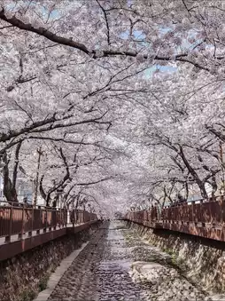 🌸 A breathtaking 1.5 km stream lined with cherry trees on both sides — the reflection in the water creates a double bloom effect that’s pure magic.