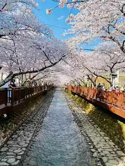 Yeojwacheon Stream: A romantic spot with cherry blossoms arching over the stream, especially enchanting when illuminated at night.