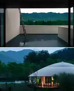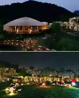 Six years in the making, the hotel covers 20,000 square meters. With the core concept of "living by the water, accompanied by bamboo," it artfully blends the simplicity of northern Zhejiang dwellings with the exotic charm of Southeast Asian resorts. Twenty-seven milky-white buildings are scattered like Tetris blocks, complemented by flower-filled courtyards and bamboo swings, creating picturesque scenes at every turn. The domed restaurant, resembling a bamboo hat, features 270-degree floor-to-ceiling windows that offer panoramic views of the bamboo forest and stream, making dining an immersive experience in nature's beauty.