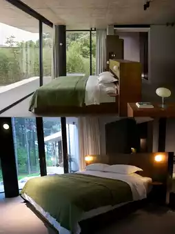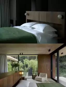 ▫️Floating Panoramic Suite🛏️: Entire room cast in concrete, 270° floor-to-ceiling windows framing the pine forest, bed facing mountain views, open your eyes to flowing greenery🌿