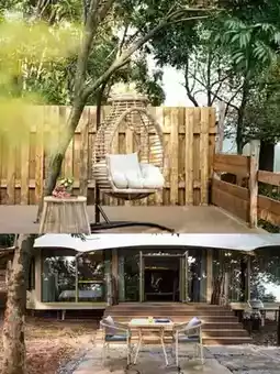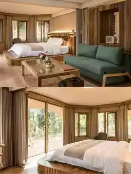 Ten luxury tents are scattered across the hillside in a Big Dipper formation, each with a private terrace and natural greenery barrier 🌳 for ultimate seclusion. The tents feature rustic wood interiors, handcrafted furniture, and floor-to-ceiling windows framing the mountain views like a painting.