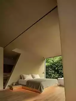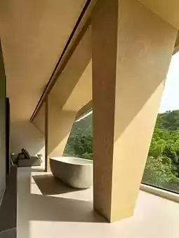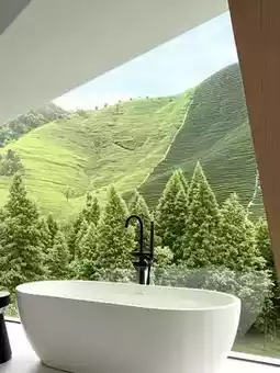 Jaw-dropping entrance! Slanted floor-to-ceiling windows frame mountain views like a giant kaleidoscope🌈 Kids tumble on tatami shouting: "We're sleeping inside crystal gems!" Triangular bathtub with citrus leaves🍊 Little ones squeeze bubbles yelling: "Giving the mountain a bubble bath~"