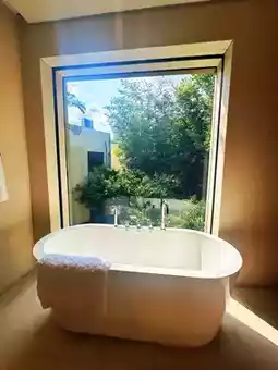 - The warm wooden interiors are incredibly soothing, featuring custom herbal toiletries. The bathtub facing mountain views is pure genius.