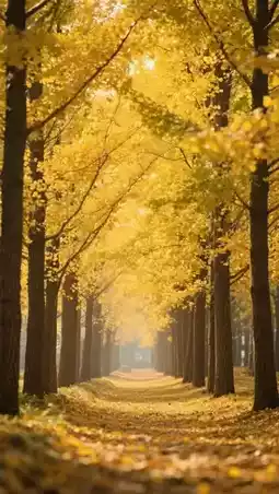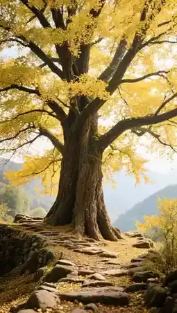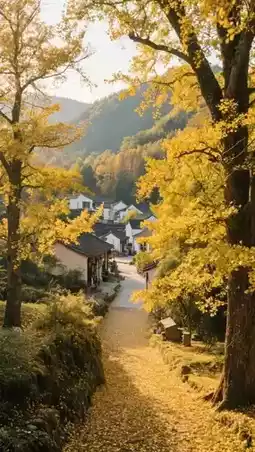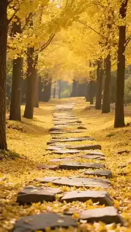 - Stroll along the stone slab ancient path, towering ginkgo trees on both sides, fallen leaves covering the ground