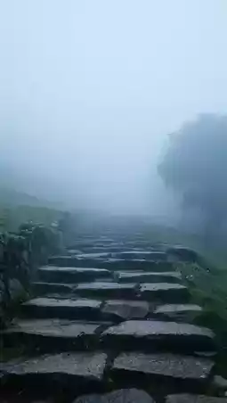 | Stone steps in morning mist | First-person view shot "walking into a fairy tale" |
