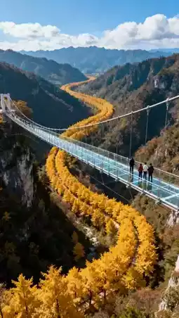 - Afternoon: Hike to Kongwang Temple and take photos with the 1,500-year-old "Ginkgo Queen." The ancient temple’s yellow walls complement the golden leaves beautifully, full of Zen charm. Then climb the Longtoushan Glass Bridge to overlook the entire corridor, which winds through the valley like a golden dragon[__LINK_ICON]. In the evening, stroll along the original ancient path in Shiwushan Village, stepping on leaves several inches thick while listening to the rustling sounds as the sun sets.