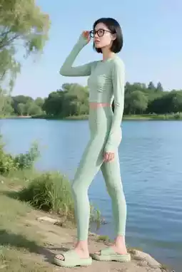 A matcha green long-sleeve cropped sports top paired with matching yoga pants, simple yet figure-flattering. The cropped top design casually shows the waistline, elongating the body proportions. Paired with matching thick-soled sports slides, not only comfortable for walking but also adding a casual and fashionable vibe. This outfit fits perfectly whether strolling through historical sites or wandering in natural scenery, and it creates a fresh atmosphere for photos 📷