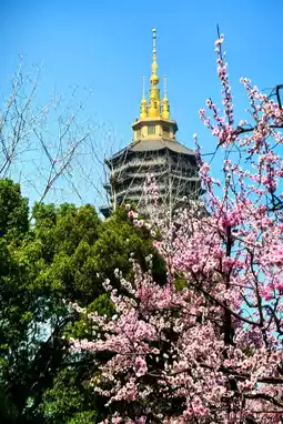 The towering Tianning Pagoda, an octagonal thirteen-story structure reaching 153.79 meters, dominates the temple grounds. From its heights, visitors can admire the winding Grand Canal, resembling a ribbon, and the lush greenery and shimmering waters of Hongmei Park, capturing the essence of Jiangnan spring.