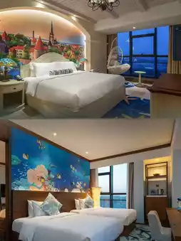 The hotel's dining experience was equally exceptional. The One Piece Seafood Restaurant boasted a unique ambiance, with custom ocean-themed tableware, marine life murals, and seashell and fish-shaped lamps. The large central screen, shared with the lobby, played ocean-themed visuals, making us feel like we were dining in an underwater world. The restaurant offered a diverse menu with fresh and delicious seafood, which my child thoroughly enjoyed.