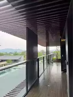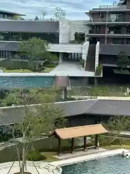 I stayed in a Garden View Suite, which included a living room, two bathrooms, and a bedroom—plus a small garden on the balcony. I never expected a Courtyard suite to be this comfortable! The panoramic view from the bedroom made me want to stay indoors all day. From the room, I could see a distant pavilion and the outdoor pool. For a light getaway, the rainy scenery was unexpectedly soothing.