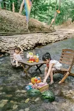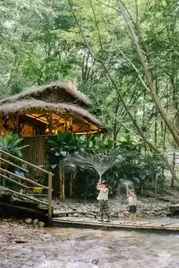Bamboo bridges, lounge chairs, lush greenery by the creek 🌿