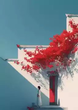 That wall is the purest rice paper in a Jiangnan courtyard, becoming more and more gentle with the passage of time. The blue-gray eaves curve like the tip of a brush, outlining the arc of the black tiles. The carved window frames under the eaves let in scattered light, weaving shadows on the white wall. The bougainvillea is the most passionate vermilion on this rice paper, clusters and strings cascading from the eaves, filling the wall with vigorous life.