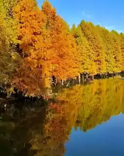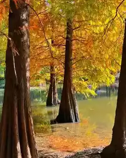 Stepping into this dawn redwood forest feels like entering an oil painting with a spilled palette. The tall dawn redwood trees stand upright, their trunks sturdy and brownish, and the leaves at the branch tips gradually change from emerald green to orange-red and golden yellow under the autumn and winter hues, layer upon layer, like a colorful carpet woven by nature itself, spreading freely by the lakeside. Sunlight filters through the gaps in the leaves, casting light and shadow that dance on the water and fallen leaves. Every shutter click is a romantic encounter with autumn and winter.